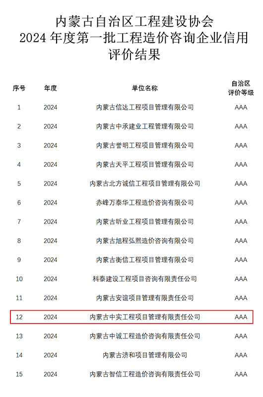 2024-07-3016979 次近期,我公司参加内蒙古自治区工程建设协会组织的“2024年度第一批工程造价咨询企业信用”申报,获得“信用AAA级证书”。我公司成立多年以来,遵循中国工程造价管理协会对造价咨询企…